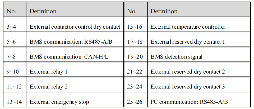 Om communicatie tot stand te brengen tussen de PCS en Controller, gebruik de RS485-interface beschikbaar op de externe aansluitklemmenstrook, zoals hieronder weergegeven. Deze klemmenstrook biedt speciale poorten voor RS485-communicatie, die wordt gebruikt voor zowel PC- als BMS-verbindingen.